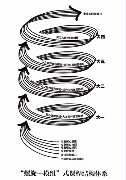 “螺旋——模组”式课程体系是达成“331素养”效能的重要路径。学院课程包括核心课程、综合实践课程、人文素养课程三大模组,6条能力线螺旋式上升,贯穿始终。