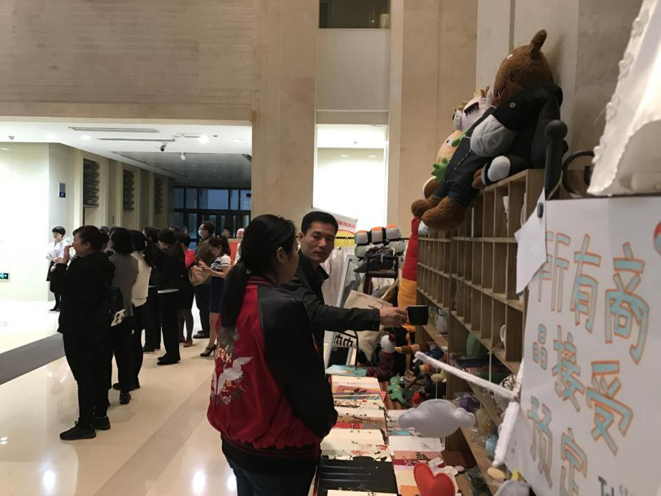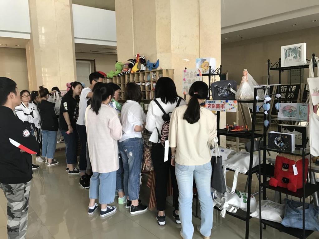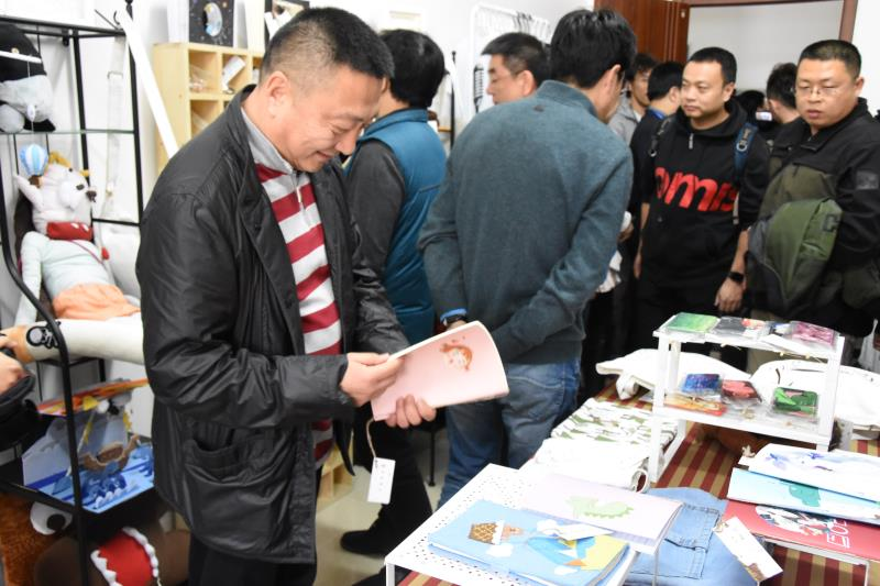 文创环廊利用教学楼二楼大厅,设置了丰富的展销架台(衣架、饰品架、明信片卡架、工艺品展示柜等)。由自由选购区、商品展示区、休息区、学生作品展示区四大区域组成。