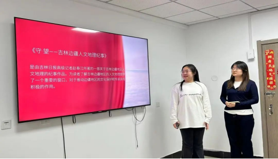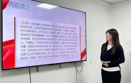 2023级新闻学专业优秀团支书王裕然对核心读本《守·望——吉林边疆人文地理纪事》进行深入介绍,包括作者背景、出版社信息、作品定位及其社会价值。活动现场还发放了实体书供同学们传阅,让大家更直观地感受文字的力量,感知作品的文化厚度与时代温度。