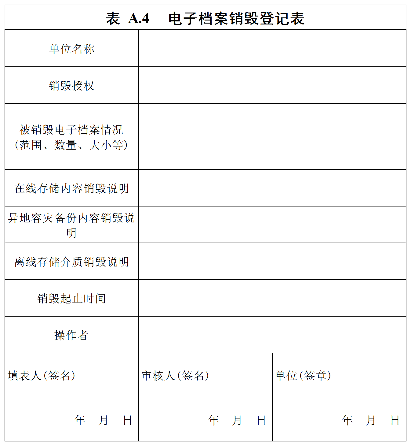 10.3.7 应填写电子档案销毁登记表(见表 A.4并归档保存。