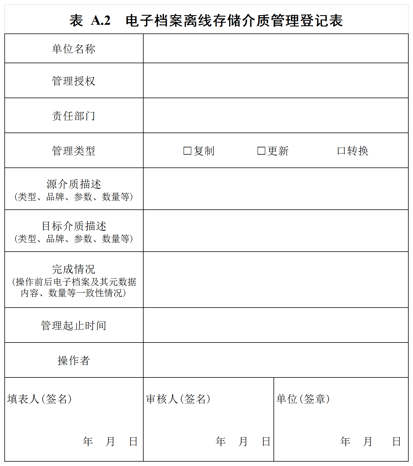 i) 确认离线存储介质的复制、更新和转换等管理活动成功时,再按照相关规定对原离线存储介质实施破坏性销毁。应对离线存储介质管理活动进行登记,登记内容参见表A.2。