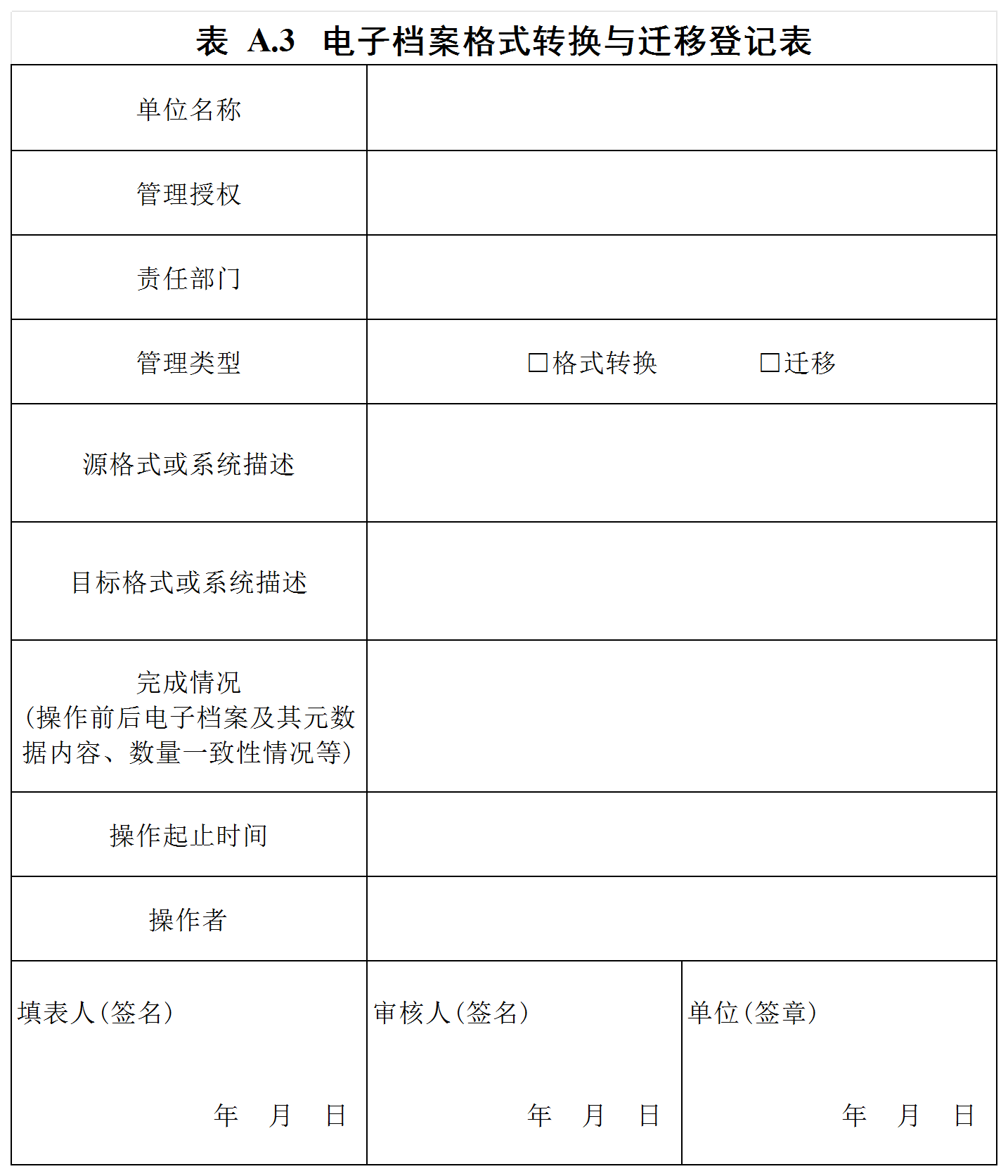 10.2.5 电子档案及其元数据库的转换、迁移活动应记录于电子档案管理过程元数据中,并填写电子档案格式转换与迁移登记表(见表 A.3