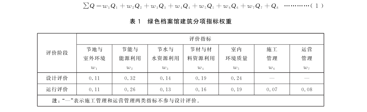 5.2.3 绿色档案馆建筑评价按总得分确定等级。设计评价的总得分为节地与室外环境、节能与能源利用、节水与水资源利用、节材与材料资源利用、室内环境质量 5 类指标的评分项得分经加权计算后与加分项的附加得分之和;运行评价的总得分为节地与室外环境、节能与能源利用、节水与水资源利用、节材与材料资源利用、室内环境质量、施工管理、运营管理 7 类指标的评分项得分经加权计算后与加分项的得分之和。