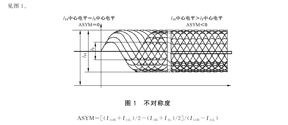 表征 DVD-R、DVD+R 光盘记录后高频信号的不对称性,用 I3 中心电平与 I14 中心电平的相对位置来描述 nT ( n =3~11、14 )坑与台的长度不对称状况。
