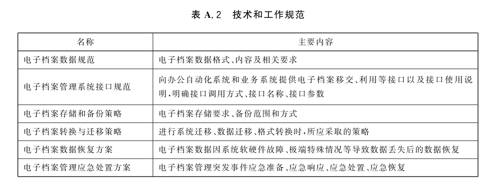 6.3 ¼¼ÊõºÍ¹¤×÷¹æ·¶Ãû³Æ¼°Ö÷ÒªÄÚÈÝÒ˲ÎÕÕ±í A.2ÖÆ¶¨¡£¼¼ÊõºÍ¹¤×÷¹æ·¶Ó¦Óë 6.2 е÷ÅäºÏ£¬Ã÷È·µç×Óµµ°¸Êý¾Ý¹æ·¶¡¢µç×Óµµ°¸¹ÜÀíϵͳ½Ó¿Ú¹æ·¶¡¢µç×Óµµ°¸´æ´¢ºÍ±¸·Ý²ßÂÔ¡¢µç×Óµµ°¸×ª»»ÓëÇ¨ÒÆ²ßÂÔ¡¢µç×Óµµ°¸Êý¾Ý»Ö¸´·½°¸¡¢µç×Óµµ°¸¹ÜÀíÓ¦¼±´¦Ö÷½°¸¡£