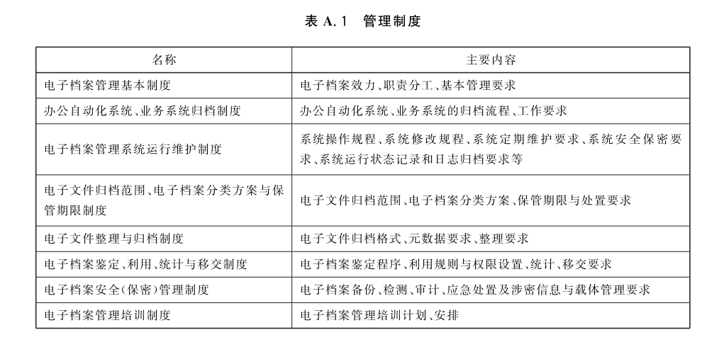 6.2 ¹ÜÀíÖÆ¶ÈÃû³Æ¼°Ö÷ÒªÄÚÈÝÒ˲ÎÕÕ¸½Â¼ A µÄ±í A.1ÖÆ¶¨¡£¹ÜÀíÖÆ¶ÈÓ¦¹æ¶¨»òÃ÷È·µç×Óµµ°¸Ð§Á¦ºÍ¸÷²¿ÃÅÖ°Ôð·Ö¹¤£¬°ì¹«×Ô¶¯»¯ÏµÍ³¡¢ÒµÎñϵͳ¡¢µç×Óµµ°¸¹ÜÀíϵͳ¹ÜÀíÁ÷³ÌºÍÔËÐÐά»¤ÒªÇ󣬵ç×ÓÎļþ¹éµµ·¶Î§£¬µç×Óµµ°¸·ÖÀà·½°¸Óë±£¹ÜÆÚÏÞ±í£¬µç×ÓÎļþÕûÀí¡¢¹éµµÒªÇó,µç×Óµµ°¸¼ø¶¨¡¢ÀûÓá¢Í³¼ÆÓëÒÆ½»ÒªÇ󣬵ç×Óµµ°¸°²È«£¨±£ÃÜ£©¹ÜÀíÒªÇ󣬵ç×Óµµ°¸¹ÜÀíÅàѵҪÇóµÈ¡£¹ÜÀíÖÆ¶È¿ÉÒÔ¸ù¾ÝÐèÒªµ¥¶À»òºÏ²¢Öƶ¨¡£