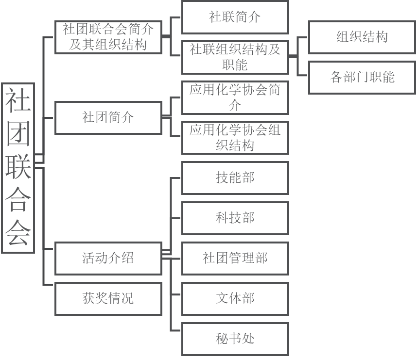 社团联合会一般为主席,各部部长,副部长,部员组成。各部门之间平行级别关系。具体组织构成如下: