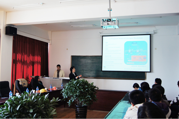 近日,韩国仁川大学生命科学学院金贞宛教授来我校讲学。金贞宛教授在生命科学学院多功能教室作了关于《茅草枯杆菌:糖元代谢和内生孢子的关系》的学术报告。生命科学学院师生聆听了报告。