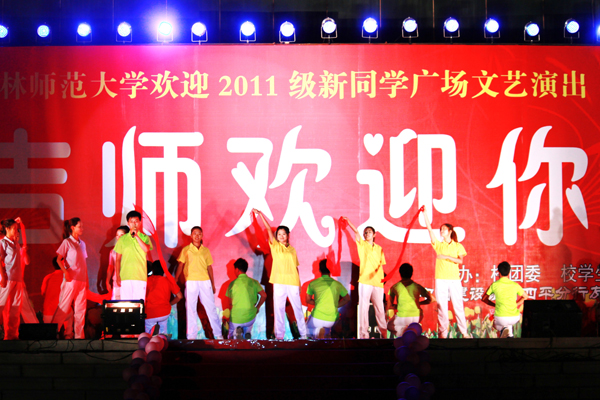9月4日晚,校团委、校学生会在主楼前广场举行欢迎2011级新同学“吉师欢迎你”广场文艺晚会,校党委副书记高林波、副校长齐奎、纪委书记王亮出席并观看演出。晚会包括歌曲联唱、舞蹈、戏曲、音诗画表演等多种形式,精彩纷呈,吸引了数千名师生和新生家长驻足观看。