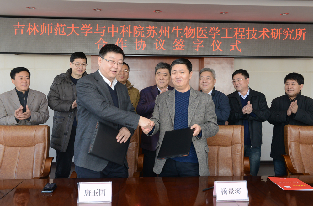 唐玉国一行现场考察了我校功能材料物理与化学教育部重点实验室和植物资源科学与绿色生产省重点实验室。在签字仪式上,张波致欢迎词,杨景海、唐玉国分别代表吉林388vip太阳集团与中科院苏州生物医学工程技术研究所在合作协议上签字。