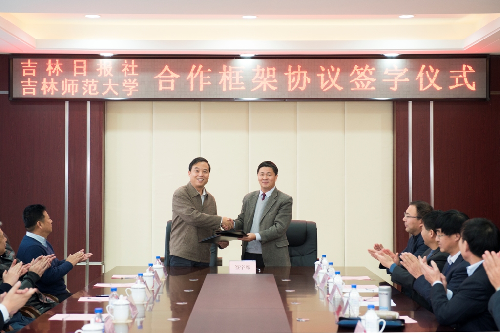 12月12日,我校与吉林日报社合作框架协议签约仪式在长春校区文化产业研发大厦举行。吉林日报社社长、党组书记邴正,总编辑李新民,副总编辑伊秀丽,我校党委书记张波、校长杨景海、党委副书记高林波、纪委书记王亮出席签字仪式。双方相关部门负责人参加签字仪式。