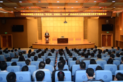 张波代表学校党委作总结讲话。他强调,学校各单位要把教育活动作为当前的一项重大政治任务来抓,相关职能部门要切实担负起组织协调任务和监督检查职责,确保活动顺利开展,并取得实效。他指出,各基层党组织及行政班子主要负责人要真正履行第一责任人责任,切实推动教育活动深入开展。全体党员干部要凝聚共识,把握要求,积极参与到教育活动中来。他强调,全体党员干部要认真落实中央、省委和学校党委关于“五一”、端午节期间的各项纪律要求,切实纠正“四风”,做到令行禁止,确保做到零违纪。他希望全体党员干部以此次活动为契机,“严守纪律紧一扣,严守规矩实一分”,使自己成为党章的模范践行者、党纪的严格遵守着,在全面从严治党的伟大实践中做出应有的贡献。