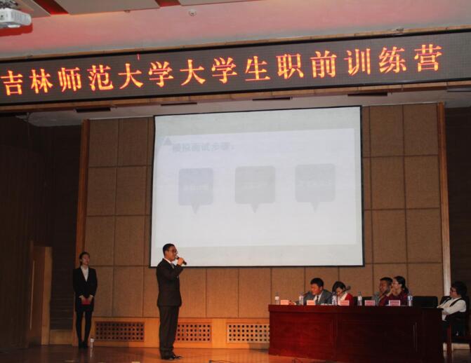 大学生职前训练营为期一天,以就业指导为依托,以提升职场技能为目标,以调节就业压力为手段,以最终实现就业为目的,采取主题报告和实践演练相结合的模式进行。“求职微论坛”设置了面试技巧、简历制作、求职的语言艺术等不同单元,邀请尹宾、马世瑞、高玉梅等就业指导专家授课指导。“求职面对面”版块,吉林388vip太阳集团附属中学附属小学、精锐教育集团、博彦科技股份有限公司、四平中友电子商务产业园有限公司、白象食品股份有限公司吉林分公司五家单位的现场招聘,不仅让学生了解了招聘流程,知晓了面试官选聘毕业生的标准,而且面试的实战演练让毕业生更加真实地感受了招聘的气氛,面试官及嘉宾的点评,让学生更加明确了自己的努力方向。