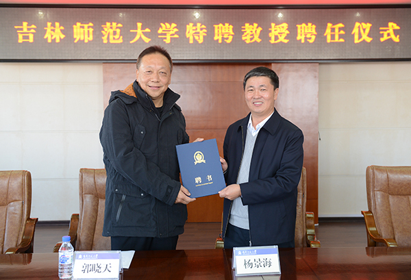 11月23日,学校在第一教学楼八楼会议室举行特聘教授聘任仪式,聘任著名作曲家、国家一级作曲、中国人民解放军武警部队政治工作部文工团创作室创作员郭晓天为我校特聘教授。校长杨景海出席聘任仪式并讲话,为郭晓天颁发聘书;副校长祖国华主持聘任仪式。学校相关部门、音乐学院负责人及部分教师代表参加了聘任仪式。