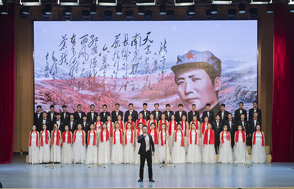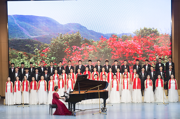 “男女老少来相送、热泪沾衣叙情长”,大合唱《告别》深情再现了军民的鱼水之情;《遵义会议放光芒》用铿锵有力地声音传递了红军在长征的危急关头,从被动走向主动,从失败走向胜利的历史转折。钢琴独奏《山丹丹花开红艳艳》曲调明亮,旋律优美,描述了红军长征胜利抵达陕北时,正逢满山的山丹丹花开的美丽情景。合唱《大会师》展现了三军会师的壮阔场景,讴歌了红军将士的血火历程和传承革命前辈的不朽精神。最后,校领导与全体演职人员、全场观众共同演唱《歌唱祖国》,将整场演出推向最高潮。