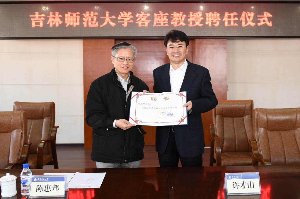 许才山在聘任仪式上致辞。他说,陈惠邦教授成为我校客座教授,是我校开展学术交流的重要成果,有利于促进我校与台湾高校在高等教育领域的交流与发展,有利于我校高水平师资队伍建设。目前,我校正以“双一流”建设为契机,坚持“六大战略”,构建“六大体系”,努力建设“六个吉师”,陈惠邦教授的加盟必将推动我校尤其是教育学科的快速发展。