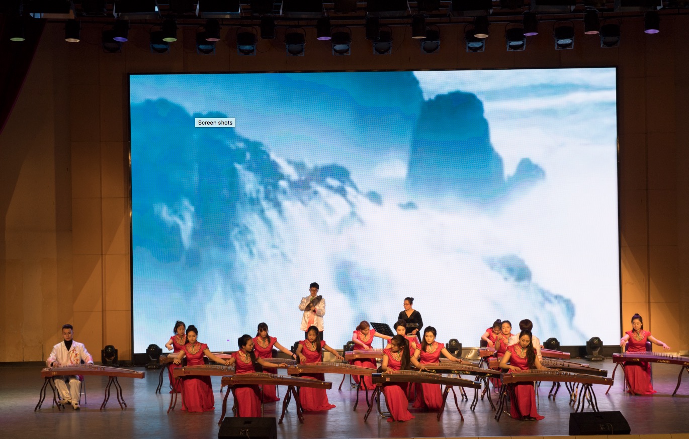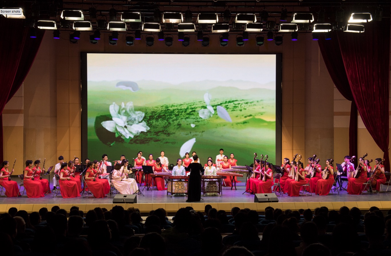 音乐会上,民族管弦合奏《花好月圆》、《茉莉花》展现了我国传统音乐虚实相生的审美意蕴,展示了国乐风华;古筝合奏《战台风》,时而温婉柔美,时而雷霆万钧、气势磅礴,技法丰富多变;马头琴、二胡合奏《牧马人》,琴声悠扬久远,二胡演奏激情奔放,勾勒出一幅极美的草原画面;笛子合奏《扬鞭催马运粮忙》体现了浓郁的东北民间音乐特色;琵琶、古筝二重奏《春江花月夜》表现了“春江潮水连海平,海上明月共潮生”的美妙音画;民乐合奏《草原英雄小姐妹》演奏了蒙古族女孩用生命保护集体财产的动人故事;二胡合奏《战马奔腾》充满了音乐激情,将二胡乐器的性能发挥得淋漓尽致。