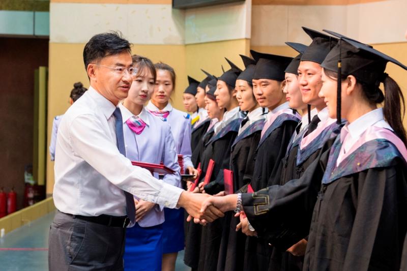 6月22日,我校2017届毕业生毕业典礼在音乐厅隆重举行。校党委书记许才山,校长杨景海,党委副书记祖国华、刘万民,纪委书记侯奎岩,副校长李海波、曲殿彬、张作岭、车广波出席毕业典礼。我校知名专家学者“长白山学者特聘教授”楠木贤道,满学专家杜家骥,韩国客座教授林成泽,吉林省优秀外国专家金佳律,“长白山技能名师”、奥运冠军李娜应邀出席毕业典礼。各学院和相关部门负责人、教师代表以及500余名毕业生代表参加毕业典礼。