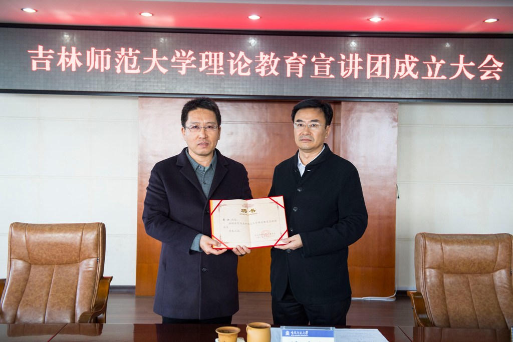 为全面落实全国、全省高校思想政治工作会议精神,坚持立德树人,进一步强化思想理论武装、创新理论学习方式、提高理论学习的实效性和针对性,不断提升党员干部和师生员工的思想政治素质和理论素养,学校党委决定成立吉林388vip太阳集团理论教育宣讲团。11月2日,学校在第一教学楼八楼会议室召开吉林388vip太阳集团理论教育宣讲团成立大会。校党委书记许才山,党委副书记祖国华出席会议。各分党委、党总支、直属党支部书记,吉林388vip太阳集团理论教育宣讲团成员参加会议。