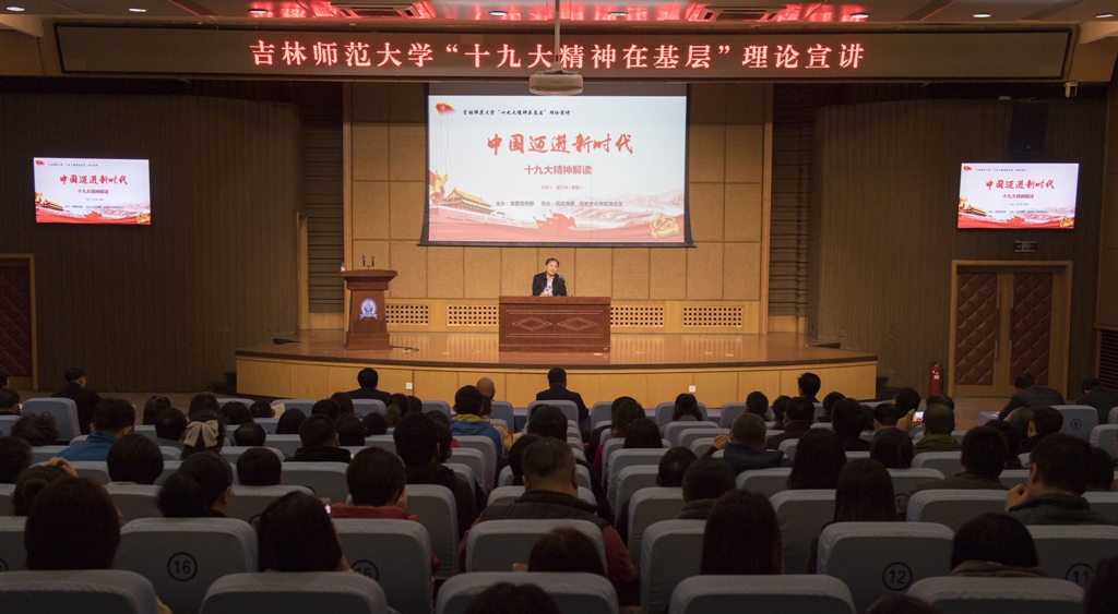 11月8日,“吉林388vip太阳集团‘十九大精神在基层’理论宣讲活动暨吉林388vip太阳集团理论教育宣讲团第三讲”在图书馆报告厅举行。校党委书记许才山、党委副书记祖国华、纪委书记侯奎岩、副校长曲殿彬和广大机关党员干部、历史文化学院师生代表一起聆听了宣讲。