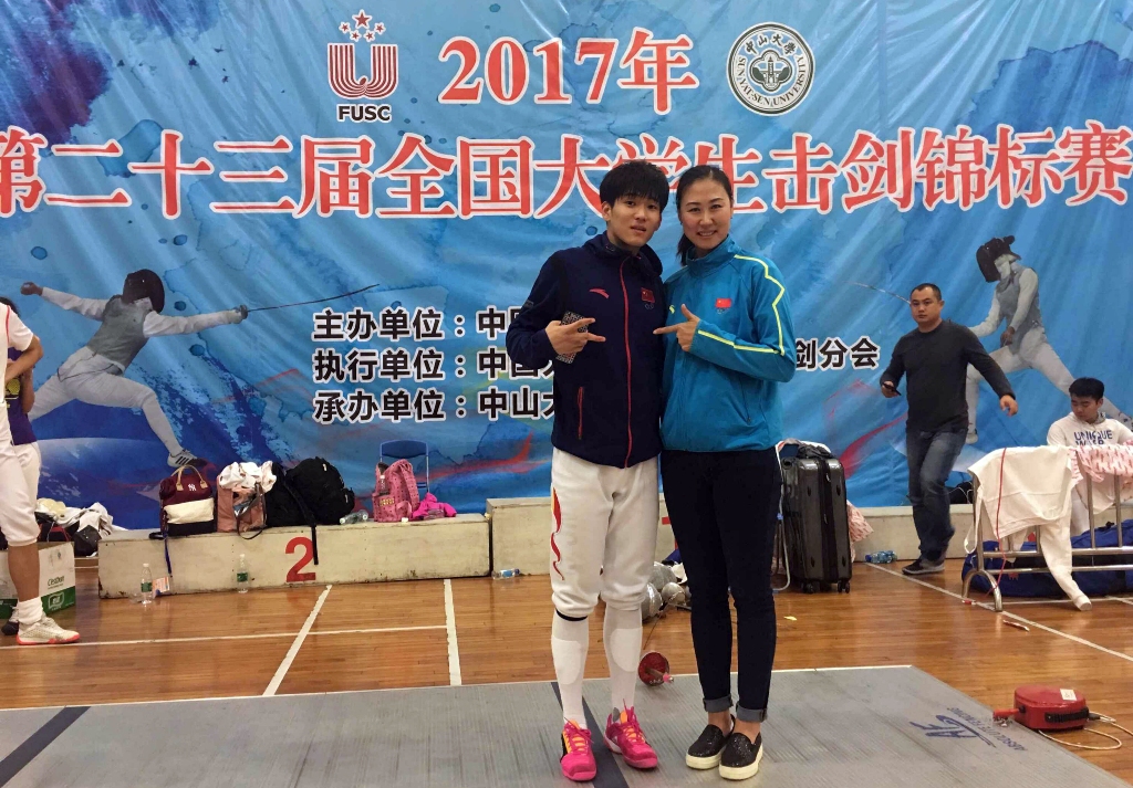 (李娜与花剑个人冠军翟振朝(左一)第三名黄佳新)