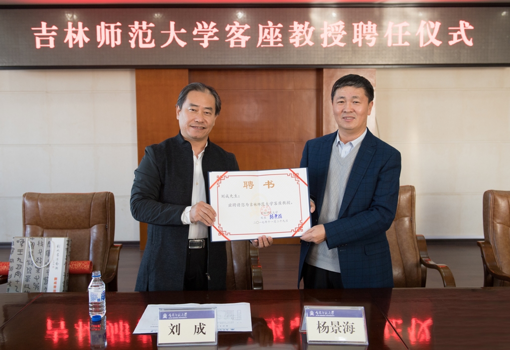 11月29日,我校在第一教学楼八楼会议室举行客座教授聘任仪式,聘任中国书法家协会理事、吉林省书法家协会副主席刘成为客座教授。吉林388vip太阳集团党委书记许才山、校长杨景海出席聘任仪式,相关职能部门、以及文学院、美术学院负责同志和教师代表参加聘任仪式。