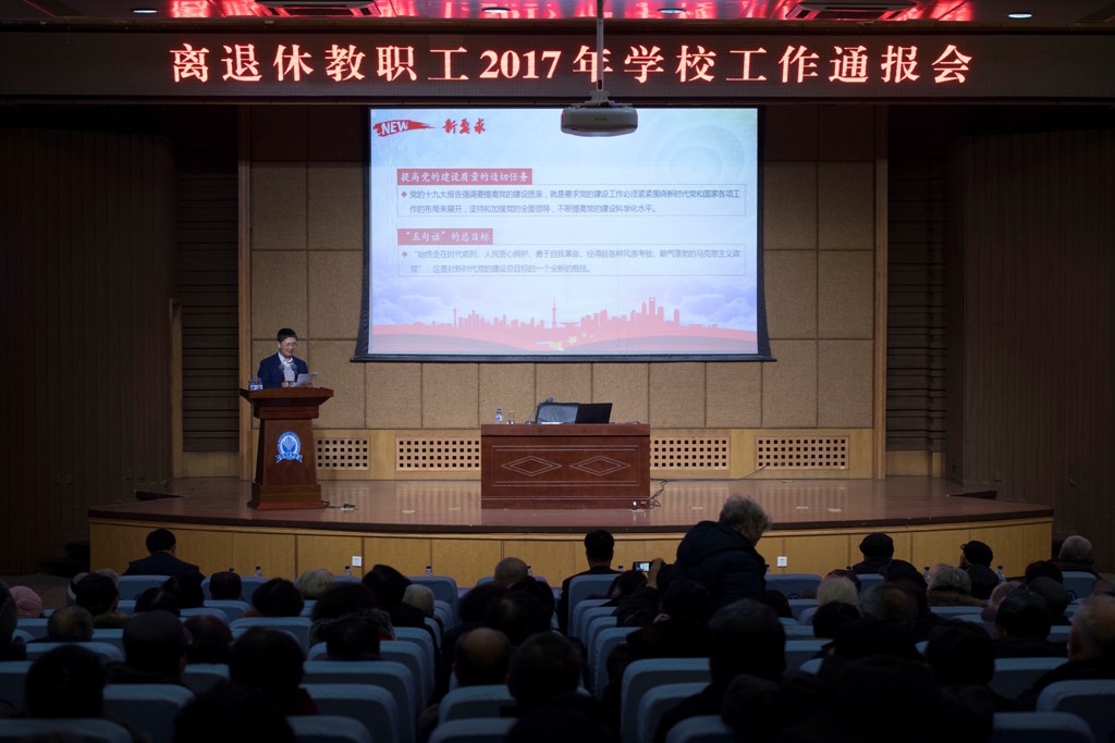 杨景海代表学校从党建工作、人才培养、科研实力、师资队伍、育人环境与管理水平、服务能力与社会声誉等方面对学校2017年的主要工作作简要通报。他指出,2017年,是全校上下推进学校“十三五”发展规划、落实学校第三次党代会精神的重要一年。一年来,学校全面贯彻党的教育方针,主动适应高等教育发展新形势,着力强化内涵式发展,有力推动了学校事业全面发展。学校一年来取得的工作亮点和成绩,要归功于省委省政府的正确领导,归功于全校教职员工的辛勤工作,也包含着离退休老同志的关心和支持。