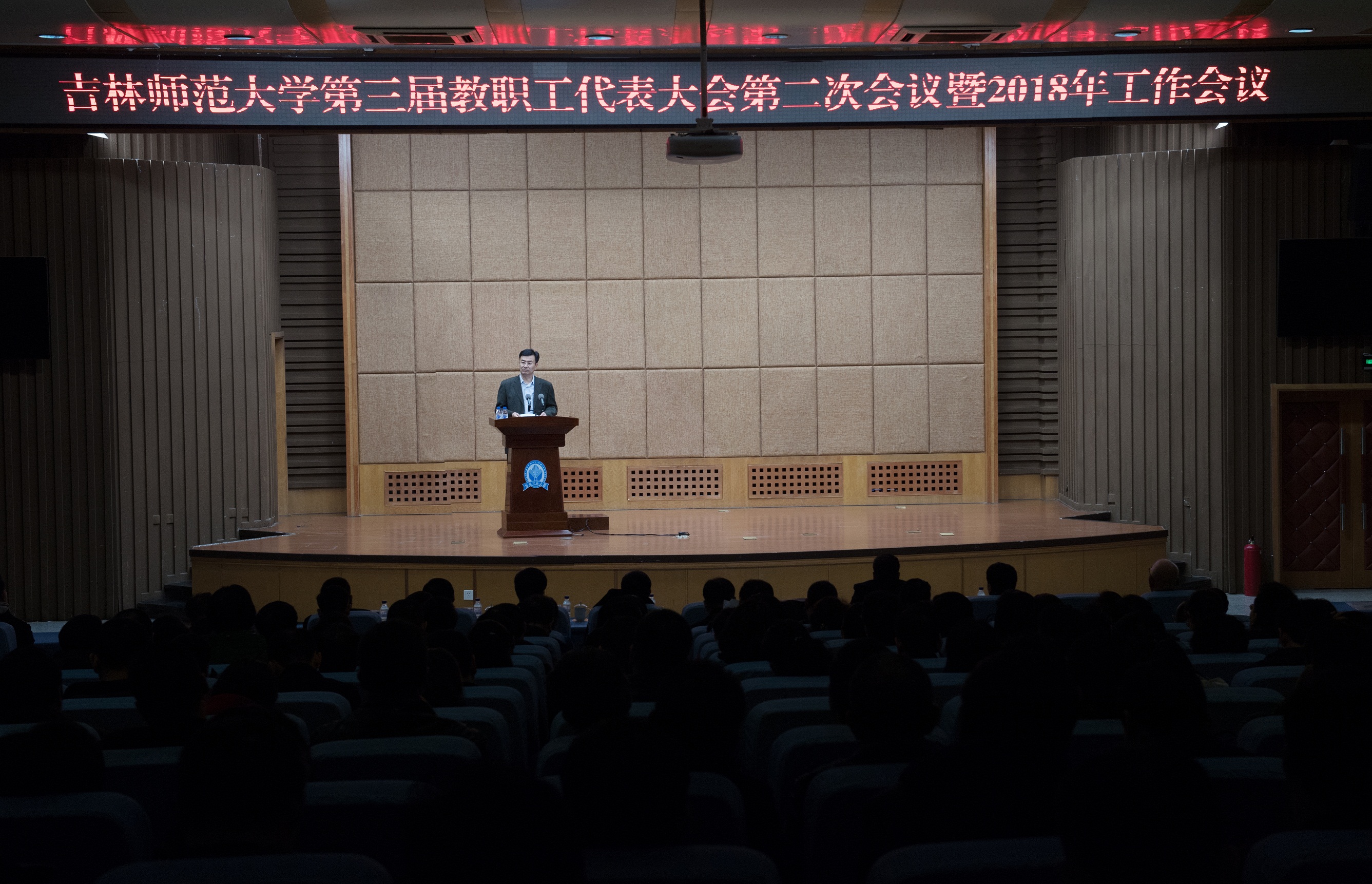 3月14日,吉林388vip太阳集团第三届教职工代表大会第二次会议暨2018年工作会议在图书馆报告厅隆重召开,大会设四平校区和长春校区两个会场。全体校领导出席会议,教代会代表、机关部门副科级(含)以上干部,其他各单位副处级(含)以上干部, 教学单位副高职称以上人员代表参加会议。会议特邀各民主党派负责人、校(院)两级关工委负责人、市级以上人大代表和政协委员出席会议。