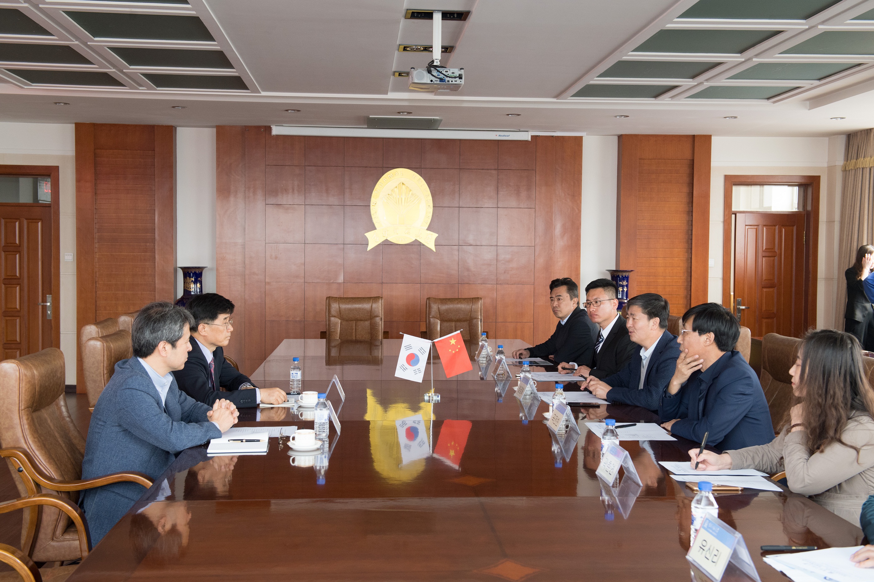 会谈中,双方就我校韩国传统文化馆施工、竣工、韩国传承工艺品运送、交接及开馆揭牌仪式、文化馆运营工作等进行了深入探讨与交流。代表团对展馆施工情况表示肯定,并就进一步完善工作提出了指导意见。双方对传统文化馆名称确定、传承工艺品摆放、说明书翻译、展馆专业人员培训、联合制作展馆宣传手册及影像资料进行了磋商。杨景海希望把韩国传统文化馆揭牌仪式做为我校六十周年特别献礼,并邀请韩国非物质文化遗产中心领导参加我校六十周年庆典。代表团一行感谢我校邀请,并表示届时会选派韩国专业传统文化表演团庆祝大典。