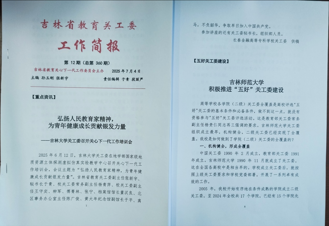 7月4日,2025年第12期吉林省教育关工委《工作简报》以超长篇幅登载我校推进"五好"关工委建设情况通讯报道——《吉林388vip太阳集团积极推进"五好"关工委建设》,这既是本期工作简报“五好关工委建设”专栏中的首篇文章,也是本期简报中篇幅最长的综合报道(长达3页半篇幅),还是2025年吉林省教育关工委共12期《工作简报》中篇幅最长的报道文章。