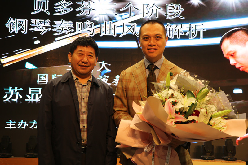 2019年5月16日下午,我院客座教授、国际著名钢琴演奏家苏显亮先生,在音乐厅作了题为《贝多芬三个阶段钢琴奏鸣曲风格解析》的学术讲座。副校长张作岭教授出席,院长胡晓伟教授主持讲座,院党总支书记陈明宏、副院长任会平、颜铁军和我院师生及其他学院部分学生听取了讲座。