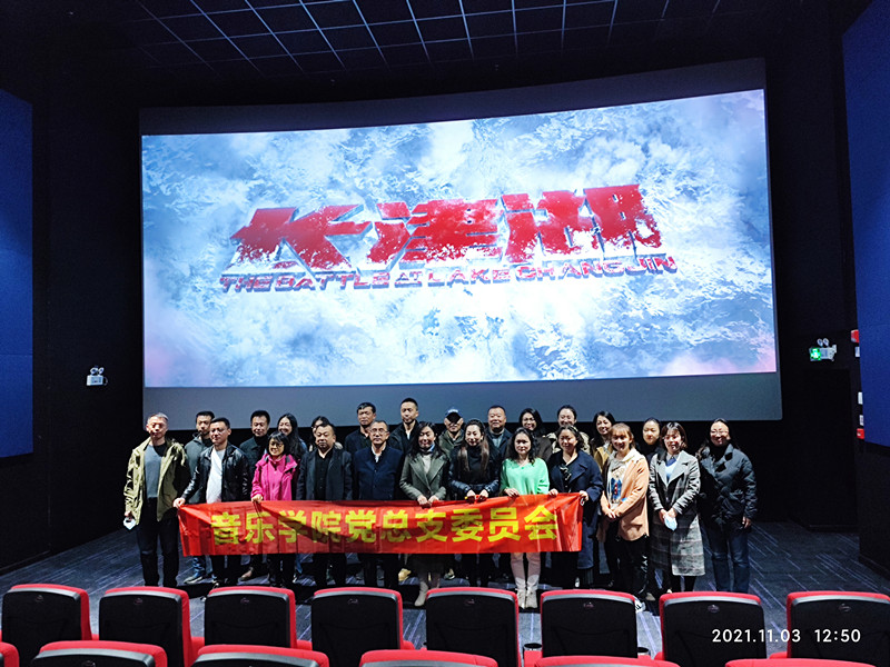为推动党史学习教育和“四史”宣传教育走深走实,进一步教育引导师生党员领悟党的伟大精神,增强党的意识观念,抒发爱国主义情怀,激发爱岗敬业和勤奋学习精神,凝聚奋进力量,音乐学院党总支于2021年11月3日下午组织全院师生党员走进影院观看爱国主义影片《长津湖》。