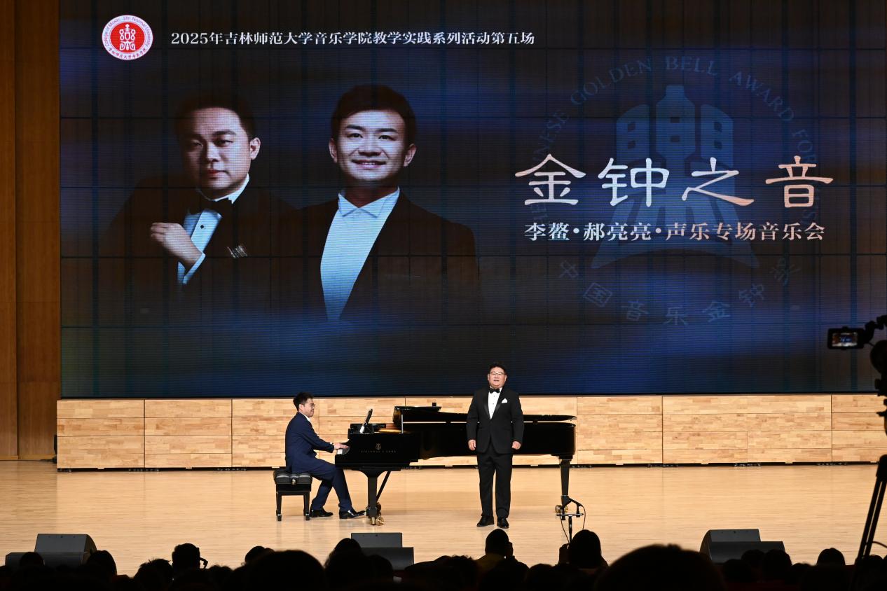 2025年4月8日晚,低男中音歌唱家、第十二届中国音乐金钟奖“美声组”总决赛第一名、山东艺术学院李鳌教授和男高音歌唱家、第十一届中国音乐金钟奖“民族组”总决赛第一名、陕西388vip太阳集团郝亮亮教授联袂举办的“金钟之音”-李鳌、郝亮亮声乐专场在音乐厅震撼上演。音乐会由东北388vip太阳集团音乐学院声乐系郝俊博老师担任艺术指导。校党委副书记赵经武、音乐学院党委书记籍卓佳、院长胡晓伟和音乐学院师生400余人观看音乐会。