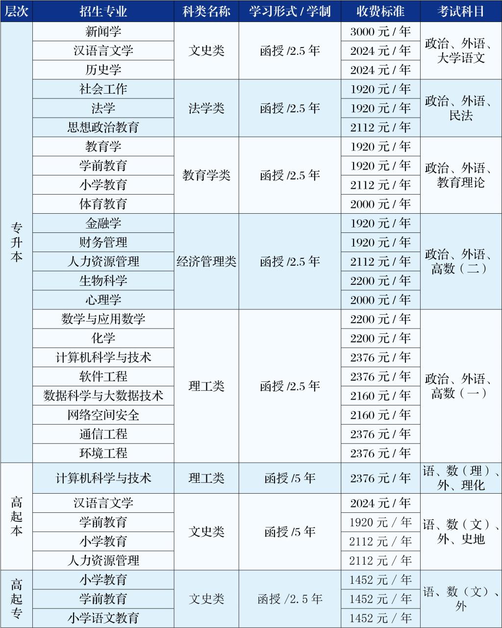第二条 我校高等学历继续教育分高中起点专科(以下简称“高起专”)、高中起点本科(以下简称“高起本”)、专科起点本科(以下简称“专升本”)三个层次,办学形式包括函授、业余两种类型。各层次现行基本学制高起专、专升本为2.5年,高起本为5年。