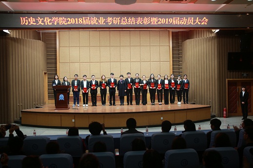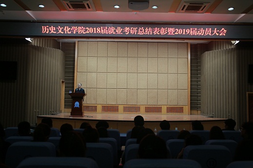 为总结和表彰先进以发挥示范引领作用,激励我院学生在新一轮考研就业工作中再创辉煌。4月18日晚,学院在图书馆报告厅召开2018届就业考研总结表彰暨2019届动员大会。学院党总支书记王伟、院长范立君、满族文化研究所所长许淑杰、副院长夏宇旭、姜小莉、党总支副书记韩强、历史系主任王立、民族系主任王兰、办公室主任李玉梅、团委书记靳妍钰、邱广军副教授、孙明副教授、张丹丹博士、石光宇博士、王子初博士以及2015、2016、2017三个年级的学生参加大会。会议由韩强主持。