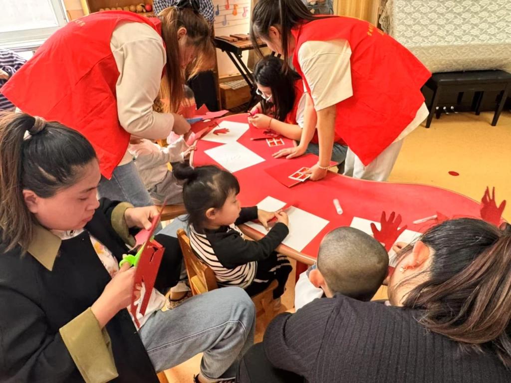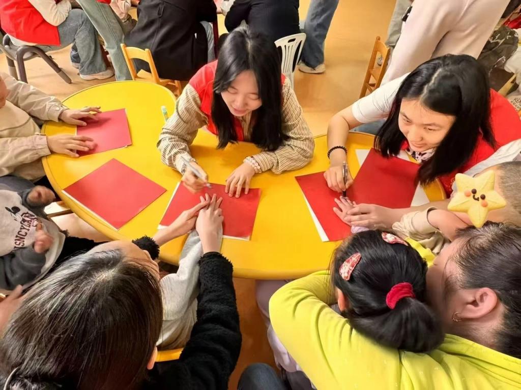 在手工制作环节,孩子们积极参与,与志愿者协作描摹手掌轮廓,将贴有国旗图案的红色手掌拓印在白纸上,象征祖国托举着残疾儿童的成长。扭扭棒在指尖翻飞成蝶,志愿者手把手教孩子们制作蝴蝶结戒指,一枚枚闪耀着童真的戒指从稚嫩的小手中诞生。心愿树上,孩子们在彩色纸片上写下质朴的愿望,在暖阳里晃成了希望的种子。这场艺术与真情的交织为孩子们的生命注入温暖亮色,也见证着志愿者与孩子们的心灵共鸣。