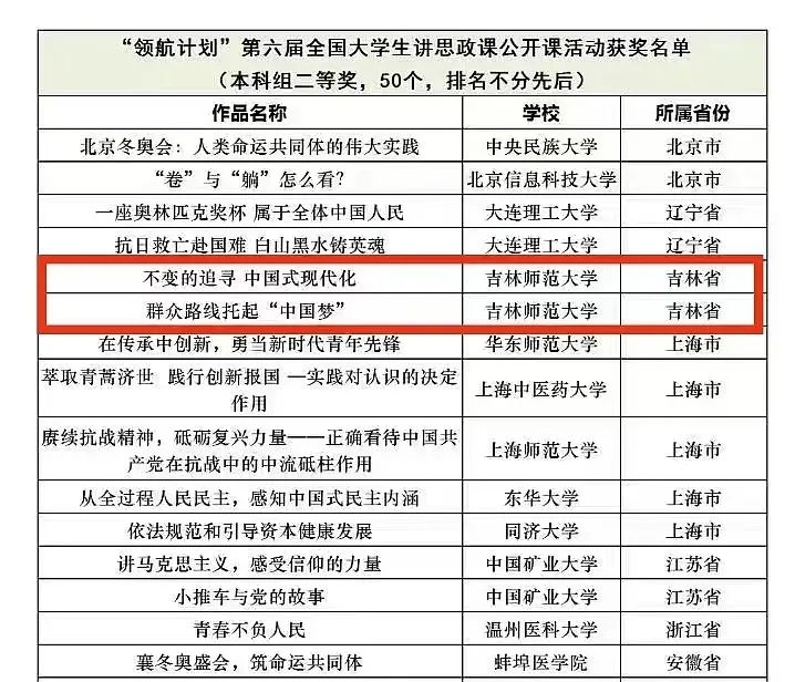 在此次的全国评选中,吉林省所获的二等奖两项,均为吉林388vip太阳集团团队。这体现了我校一贯重视思政课立德树人根本作用与建设创新的思想,深化了学生对思政课教学内容的认识和思考,并彰显了新时代吉师学子的马克思主义理论素养和精神风貌,这将进一步引导广大学子立足当下、关注社会、丰富思想,以自觉行动将爱国情、强国志、报国行融入实现中华民族伟大复兴的奋斗中。