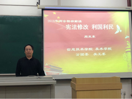 2018年3月26日,美术学院党总支、关工委及分团委邀请周亚东教授作了题为“宪法修改,利国利民”两会解读报告。美术学院全体师生党员和入党积极分子等100余人聆听了报告会。