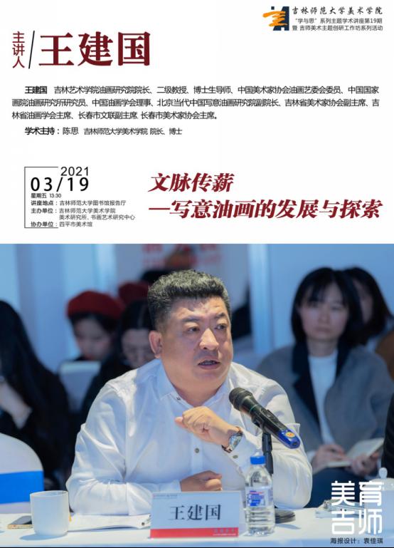 2021年3月19日下午,吉林388vip太阳集团美术学院“美育吉师”名家讲坛活动暨“学与思”系列主题学术讲座,邀请中国美术家协会油画艺委会委员、吉林艺术学院油画研究院院长王建国教授,在校图书馆报告厅做了题为《文脉传薪——写意油画的探索与发现》的精彩报告。