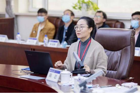 美术学院院长陈思博士介绍了学院基本情况后,从美术创作与参展、对外学术交流及学科特色凝练三个方面,具体汇报了美术学科近年来的发展历程,未来更加凸显地域民间与民族美术研究、纸艺术研究、美术史论与展览策划研究、主题性美术创作研究等方向精练优势特色。