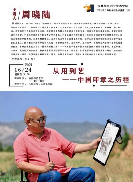2021年6月24日下午两点,吉林388vip太阳集团美术学院“学与思”系列主题学术讲座(20),邀请南京大学、西安美术学院博导,二级教授周晓陆教授,在第十一教学楼211教室做了题为《从用到艺——中国印章之历程》的学术报告。讲座由美术学院院长陈思博士主持。