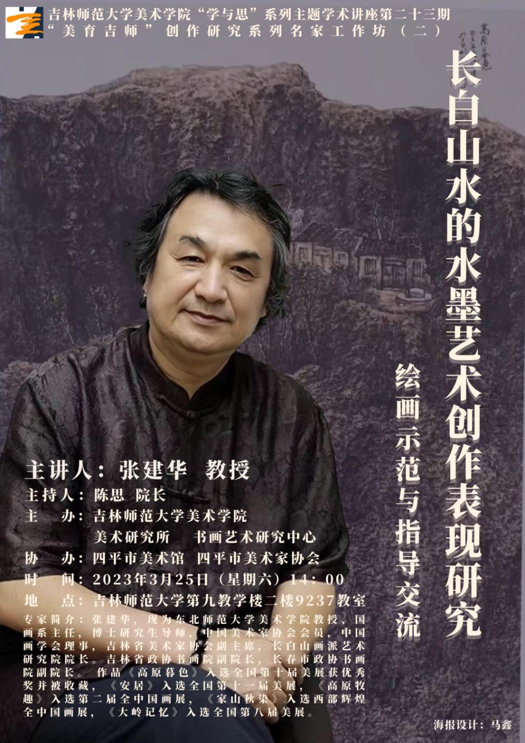 3月25日,东北388vip太阳集团美术学院教授、国画系主任、博士研究生导师,吉林省美术家协会副主席,长白山画派艺术研究院院长张建华教授应邀来到吉林388vip太阳集团美术学院,为师生们带来了一场主题为《长白山水的水墨艺术创作表现研究》的精彩讲座与创作示范。四平市美术馆馆长、四平市美协主席王小清等嘉宾莅临现场参与交流。活动由美术学院院长陈思博士主持。