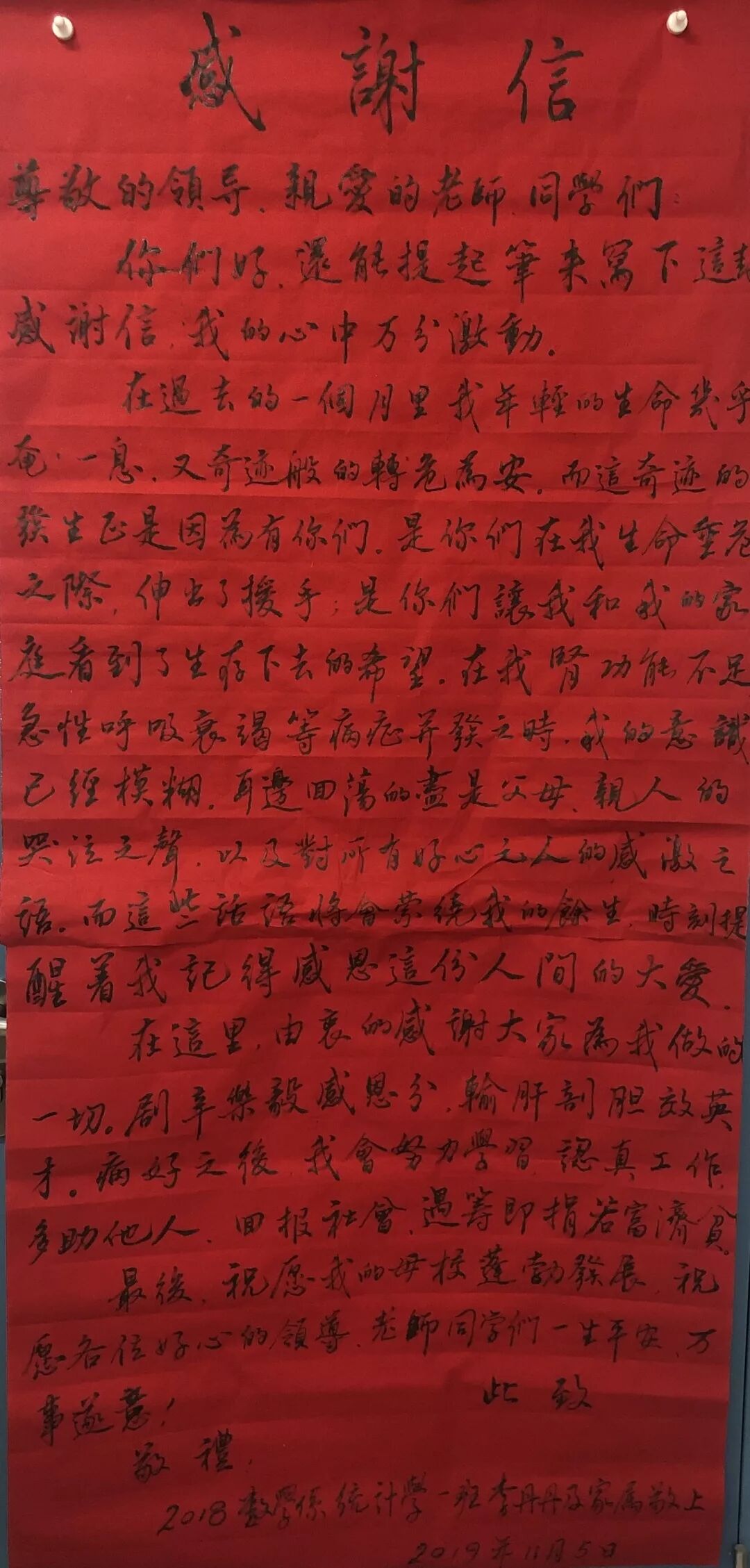 “命悬一线,与病魔硬磕的九天九夜。” “全家的希望与骄傲,花儿一样的年纪,高额的手术费用,逼近绝望的病情。” 治,前景未卜、无力承担;不治,至亲骨肉、身心何安?这个需要同时抚养三个孩子的农村家庭,对每天近三万元的治疗费用真的是束手无策,而且,不知道还会在重症呆多久。无奈无措之际,李丹丹的家人向吉林388vip太阳集团数学学院发出了求助,此时,正是学校开展“不忘初心、牢记使命”主题教育期间,数学学院在得知李丹丹最新病情和家庭实情之后,即刻召开学院党政联席会,第一时间以数学学院党委的名义向全院师生发出了“为2018级统计学专业李丹丹捐款”的倡议,积极转发“水滴筹”,同时向学校领导和职能部门汇报最新近况。一时间,李丹丹的病情瞬间牵动着“吉师师生”“吉师校友”的心,学校领导、教师、学生,领导的同学,教师的家属,学生的家长以及社会爱心人士,纷纷献出爱心,以小水滴聚大爱。