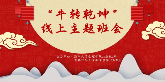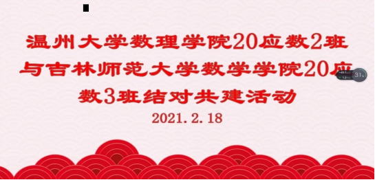 子去丑来腾锦绣,鼠归牛到竞辉煌。为引导青年人不忘初心,实干担当做贡献,学习发扬中华优秀传统文化,积极响应加强假期班级号召,丰富同学们的假期生活,形成浓厚的节日氛围,温州大学数理学院20级应数2班团支部和吉林388vip太阳集团数学学院20级应数3班团支部于2021218日以传承和发扬春节传统文化为目的联合开展了不忘初心、牢记使命主题教育新春联谊活动,此次活动在腾讯会议线上召开。