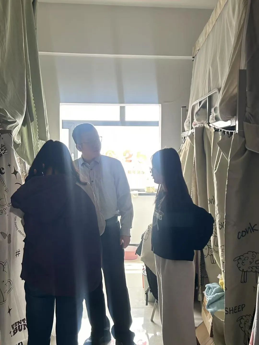 工作组先后对办公区、教学区、寝室区等重点场所进行了全面细致的排查。在双创2楼和主教语音室,重点查看了教学设备运行、消防安全设施配备情况,确保教学环境安全有序;在11教教学楼,对教室门窗、用电线路等进行逐一排查,及时发现并处理潜在安全隐患;在学生公寓,与学生亲切交流,提醒大家注意假期消防安全、财产安全、交通安全,饮食安全。同时检查了寝室卫生及违规电器使用情况。