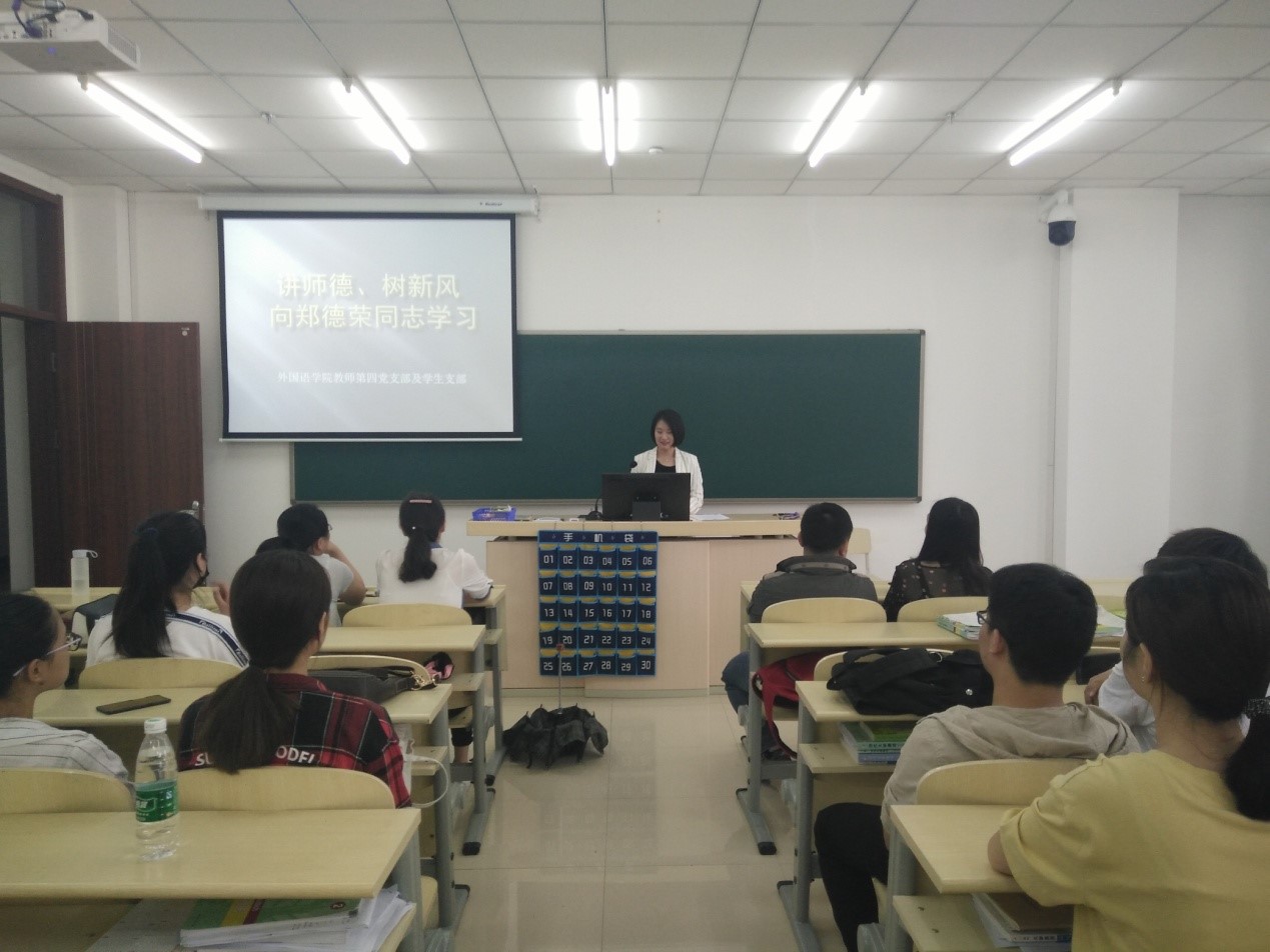 为贯彻落实学校党委及外国语学院党委对深刻学习领会郑德荣同志的崇高精神的要求,推进“两学一做”学习教育常态化、制度化,始终保持着“不忘初心、牢记使命”的理想信念,外国语学院教师第四党支部联合学生党支部于2018年6月14日下午在长春校区研发大厦807室共同举行了主题为“讲师德、树新风——向郑德荣同志学习”的“两学一做”学习教育。