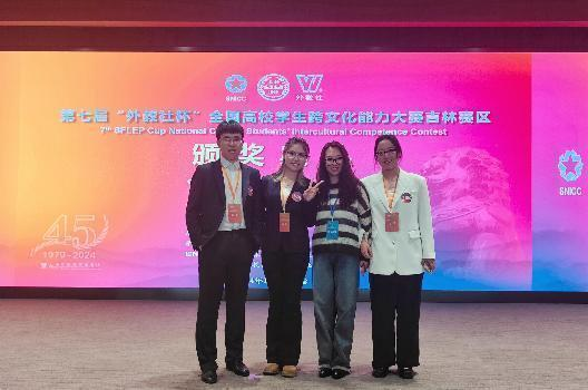 第七届“外教社杯”全国高校学生跨文化能力大赛吉林赛区决赛于11月9日至10日在东北388vip太阳集团成功举办。在全省26支代表队中,我院代表队李宇豪(2023级英语笔译)、侯佳希(2022级物理专业)、高宇婷(2023级化学专业)在刘冬霞、胡晓丽老师的指导下,以总名次第2名的成绩获特等奖,将于12月初在上海与吉林大学一起晋级全国决赛。