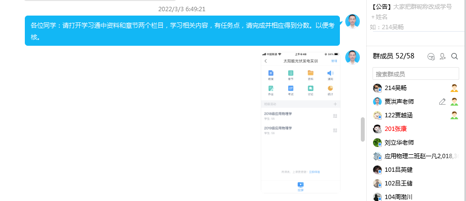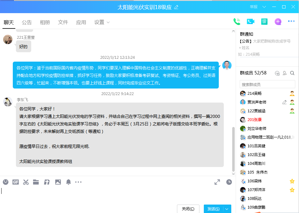 如何设计在线实验课程项目,使学生做到“隔空”在线做实验,培养学生的自主学习能力和实践动手能力,是实验课程在线教学的严峻考验。太阳能发光实训课程教学团队前期积极开展教学改革,在学校网络教学平台上建设了丰富的实验教学视频和教学资源,为此次网络教学做了铺垫。此外,组建实验课程QQ群,为教学做好互动实施等准备。同时,针对目前的疫情防控形势,我们教师团队也在QQ群中增加了部分思政教育内容,鼓励大家携手同心一同克服困难,也要懂得感恩,大力支持学校和学院的疫情防控工作安排。