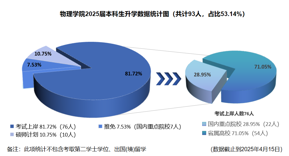 研途璀璨星辉耀,金榜题名展宏图。物理学院2025届本科毕业生175人,93人录取为硕士研究生,升学率为53.14%,较2024年提升了6.32个百分点,升学率稳步上升。其中,考取南开大学、厦门大学、吉林大学、东北大学、北京理工大学和陕西388vip太阳集团等国内重点院校29人,占31.18%,考研质量显著提升。优异成绩的取得,既是莘莘学子努力拼搏和不懈奋斗的结果,也是学院不断提高教学质量、注重学风建设的优秀成果展现。