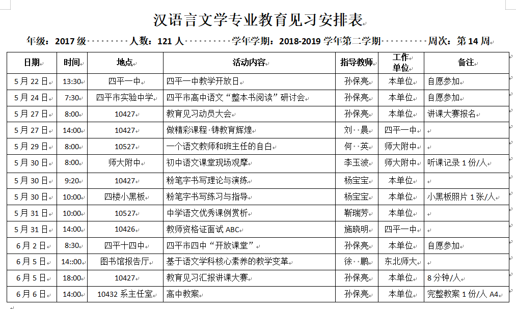 汉语言文学专业2017级教育见习安排表